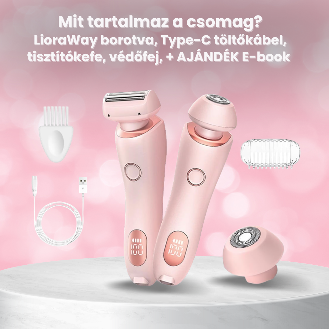 A csomag tartalmazza a LioraWay SelyemBorotvát, egy USB töltőkábelt, egy tisztítókefét és egy védősapkát, hogy mindig higiénikusan és biztonságosan használhasd.
